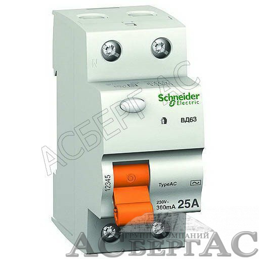 ВД63 Дифф. выкл. нагрузки (УЗО) 2-х полюсный 25A 300mA, тип АС Домовой Schneider Electric