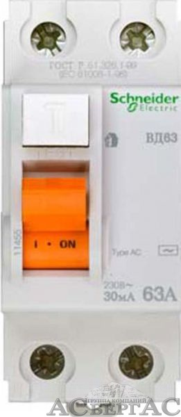 ВД63 Дифф. выкл. нагрузки (УЗО) 2-х полюсный 63A 30mA, тип АС Домовой Schneider Electric