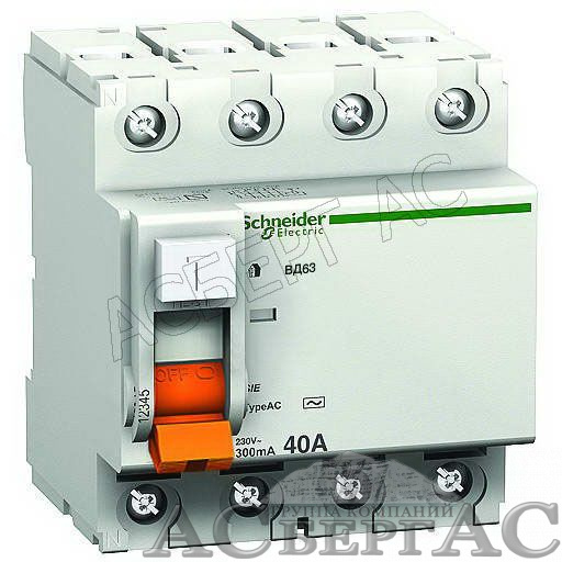 ВД63 Дифф. выкл. нагрузки (УЗО) 4-х полюсный 40A 300mA, тип АС Домовой Schneider Electric