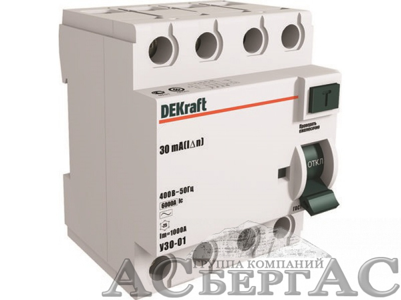 УЗО-03 Блок утечки тока 4-полюсный, 25А, 30mA, тип A, 6кА DEKraft