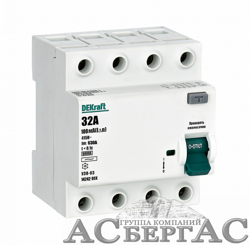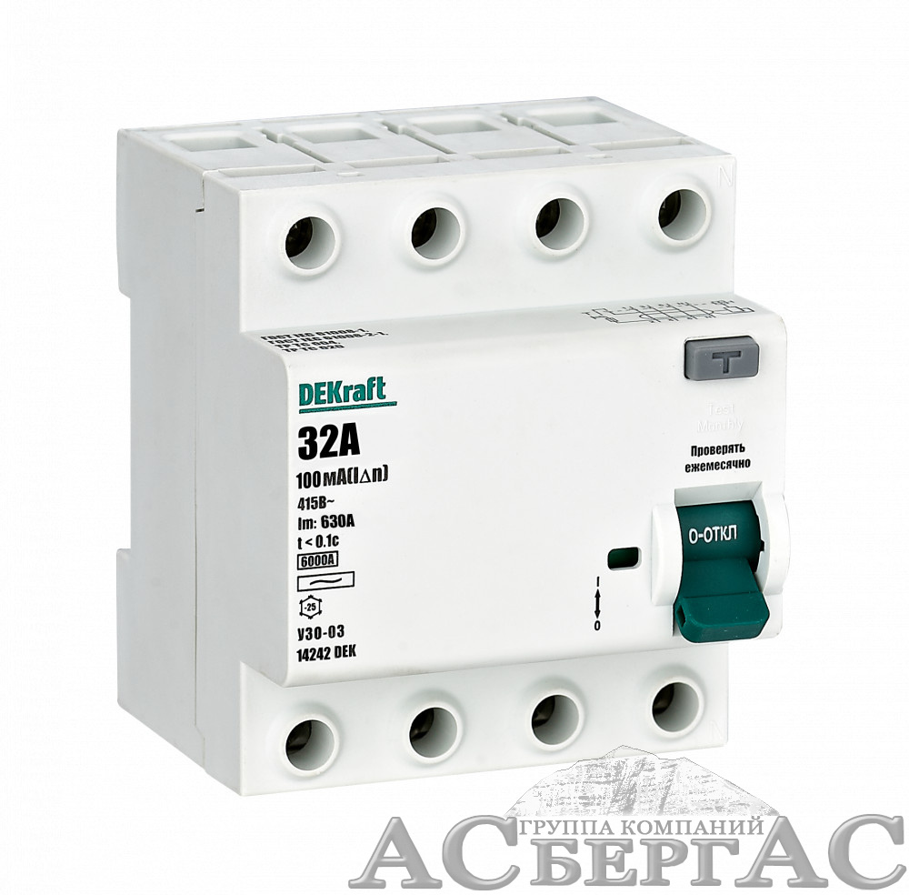 УЗО-03 Блок утечки тока 4-полюсный, 32А, 100mA, тип AC, 6кА DEKraft