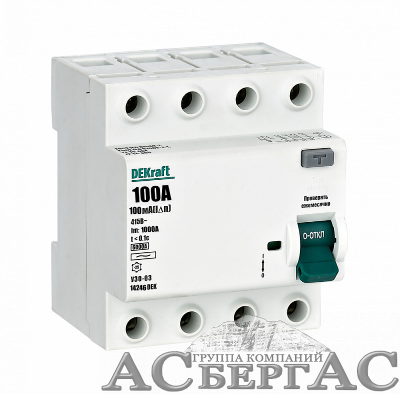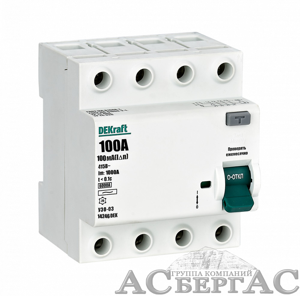 УЗО-03 Блок утечки тока 4-полюсный, 100A 100mA, тип AC, 6кА DEKraft