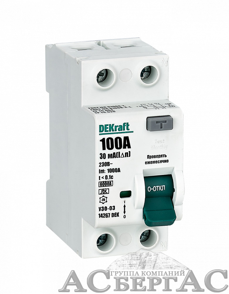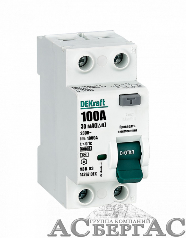 УЗО-03 Блок утечки тока 2-полюсный, 100A 30mA, тип A, 6кА DEKraft
