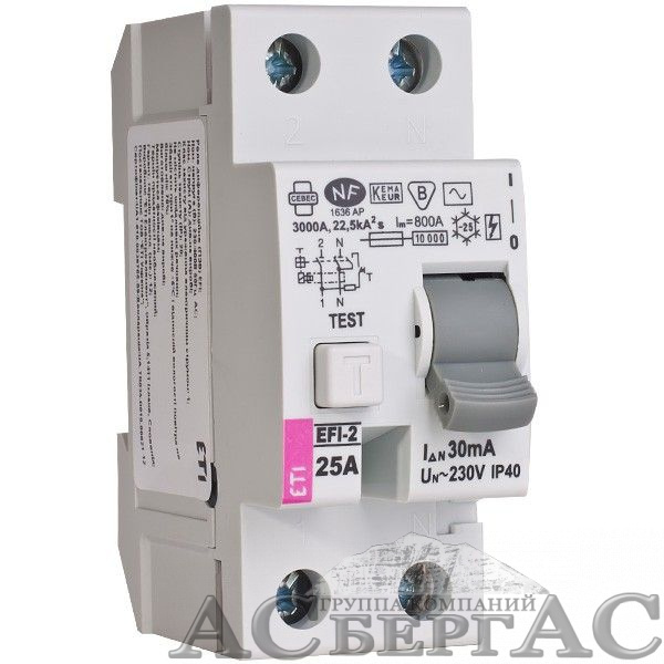 EFI- 2 25/0,03 AC (10kA) Устройство защитного отключения 2-полюсное, 25А, 30мА ETI