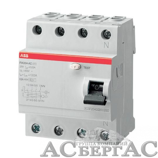 FH204 A-25/0.03 Блок утечки тока 4-полюсный, 25А, 30mA, тип A (УЗО) ABB