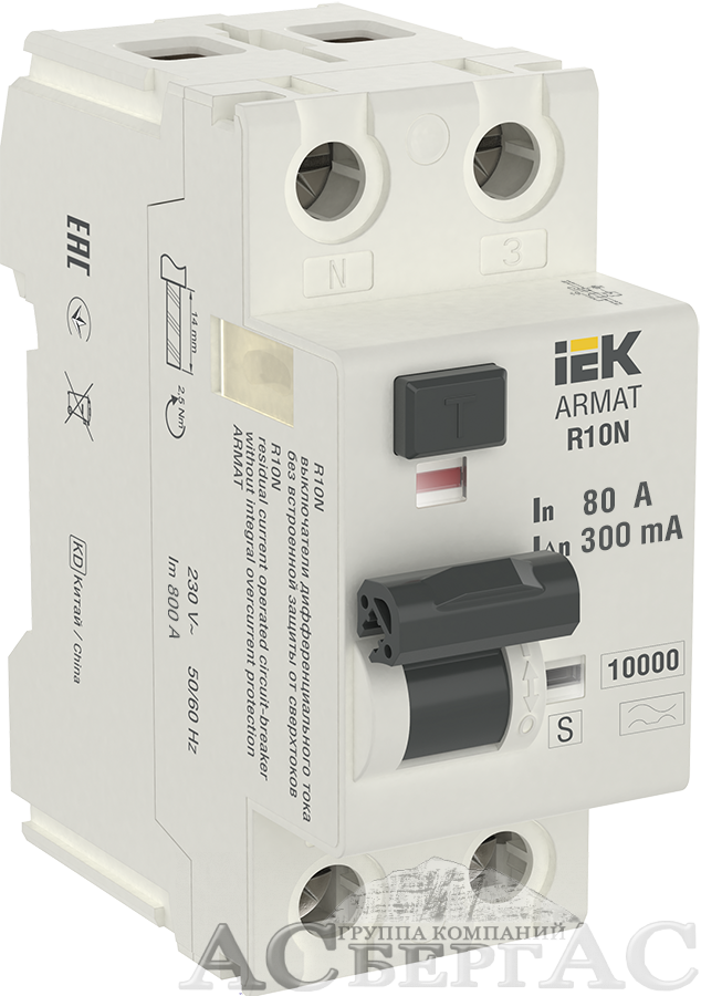 R10N Блок утечки тока 2-полюсный, 80А 300mA, 10kA, тип A-S ИЭК