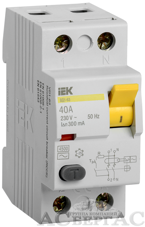 ВД1-63 Блок утечки тока 2 полюсный, 40А, 300mA, 4,5kA, тип AC ИЭК