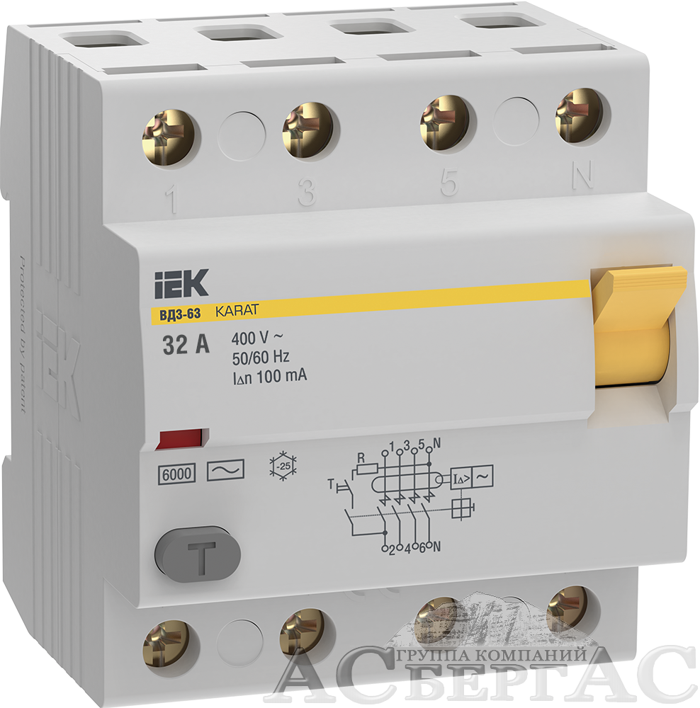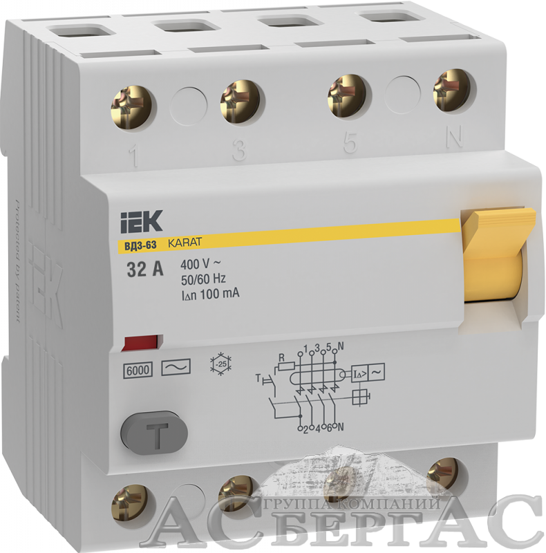 ВД3-63 Блок утечки тока 4-полюсный, 32А 100mA, 6kA, тип AC ИЭК