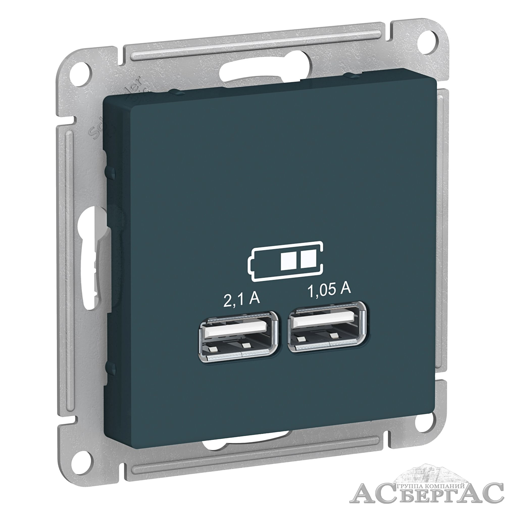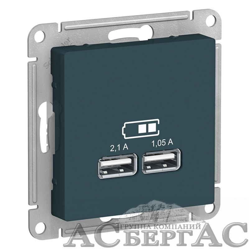 Розетка USB, 5В, 1 порт x 2,1 А, 2 порта х 1,05 А, механизм (изумруд) Atlas Design Systeme Electric