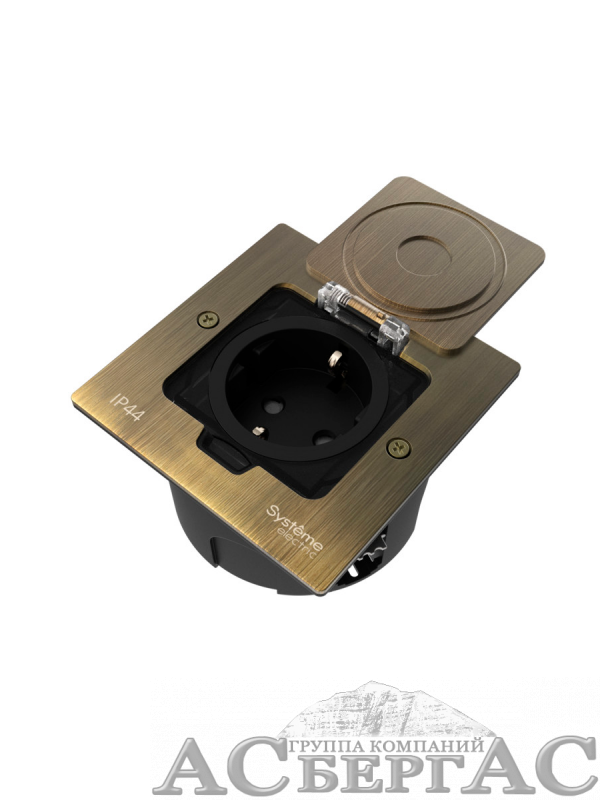 Лючок с розеткой 2К+З, 16А/250В, IP44 с монтажной коробкой для стены/фальшпола/стола (античная латунь) MultiDesk Systeme Electric