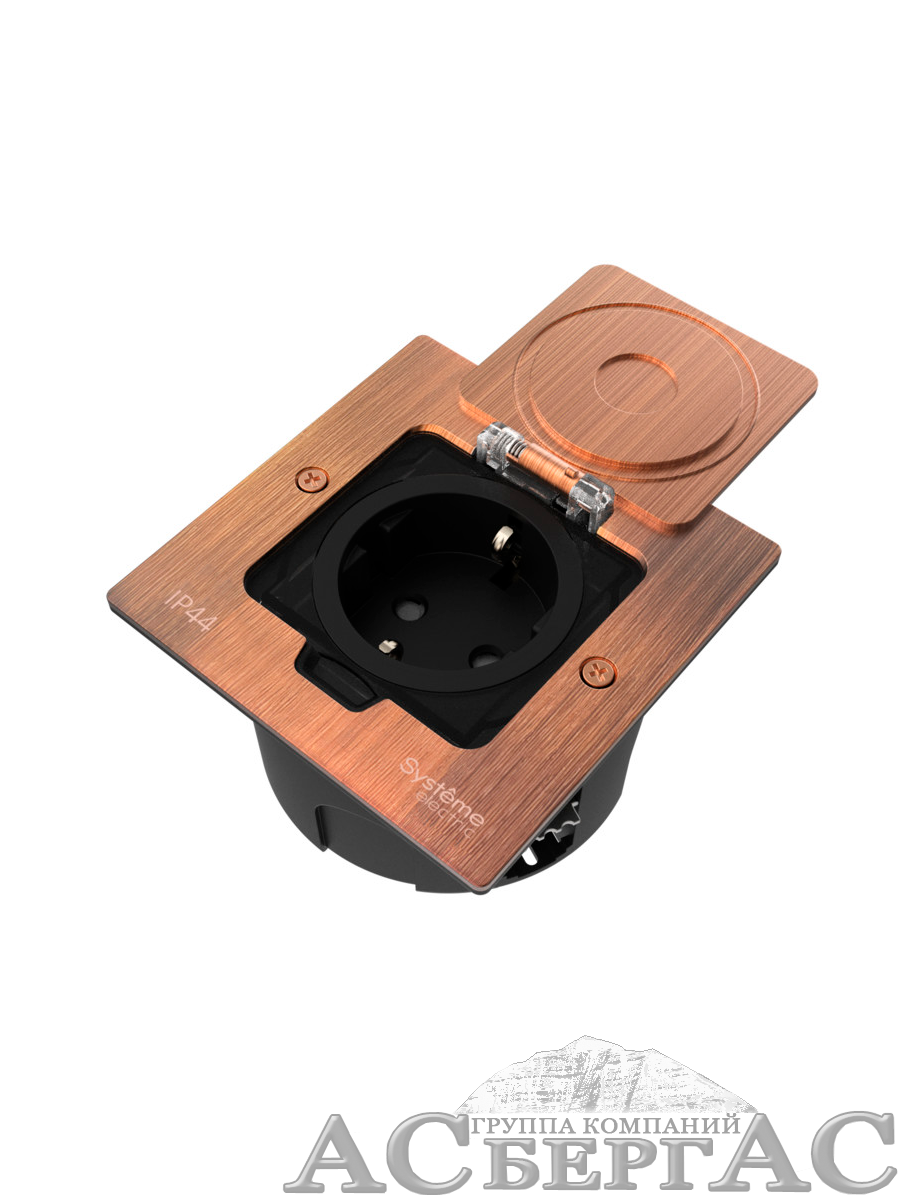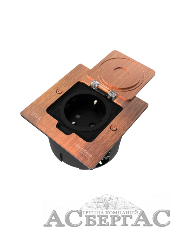 Лючок с розеткой 2К+З, 16А/250В, IP44 с монтажной коробкой для стены/фальшпола/стола (медь) MultiDesk Systeme Electric