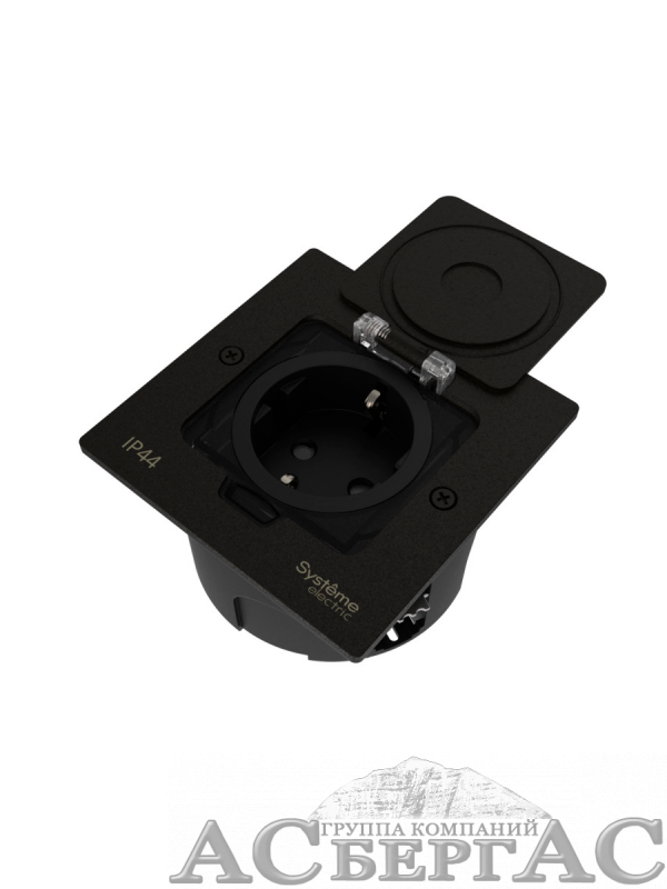 Лючок с розеткой 2К+З, 16А/250В, IP44 с монтажной коробкой для стены/фальшпола/стола (черный матовый) MultiDesk Systeme Electric