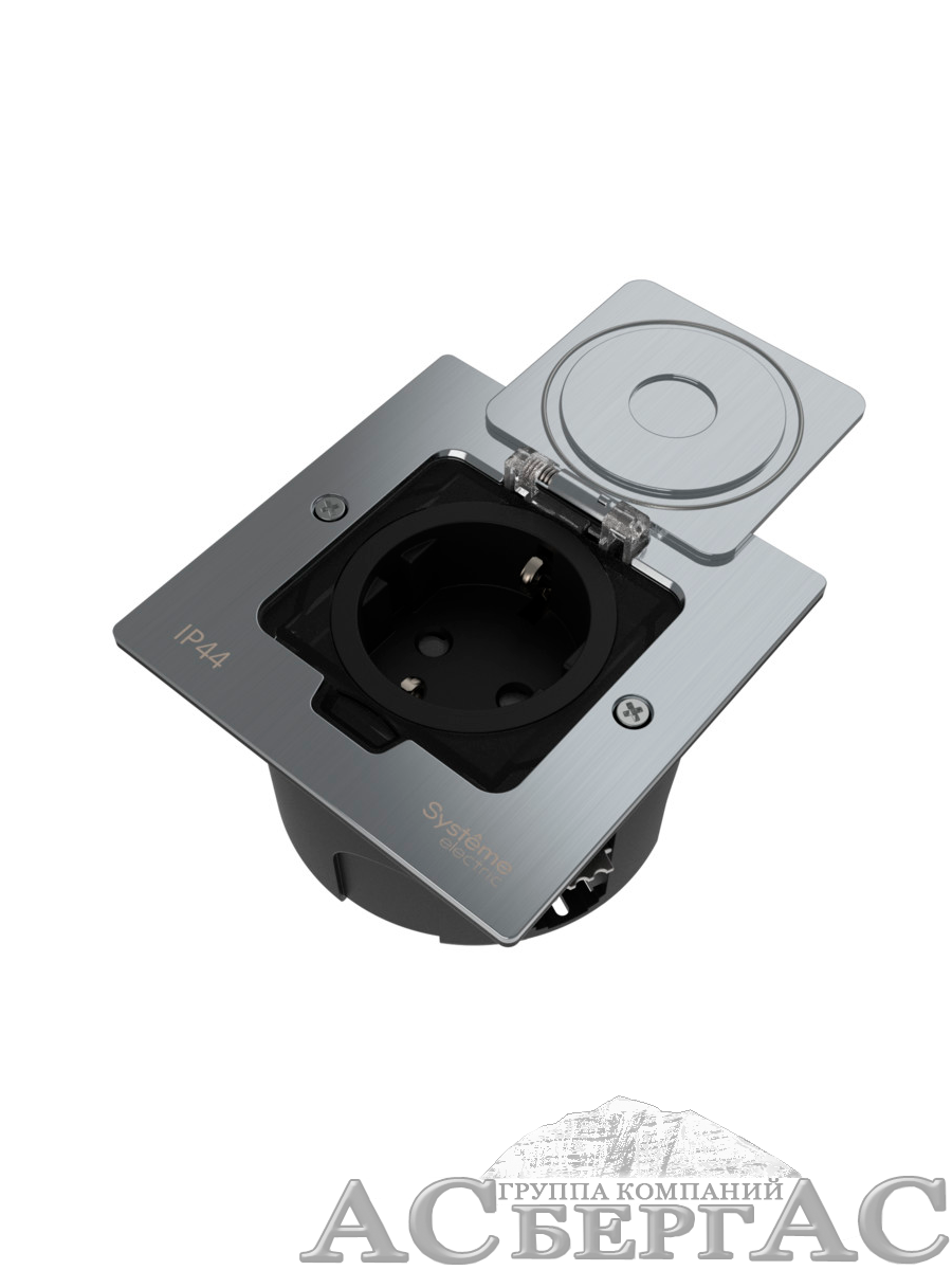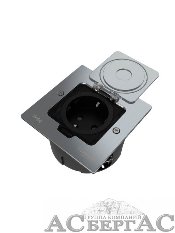 Лючок с розеткой 2К+З, 16А/250В, IP44 с монтажной коробкой для стены/фальшпола/стола (серебро) MultiDesk Systeme Electric