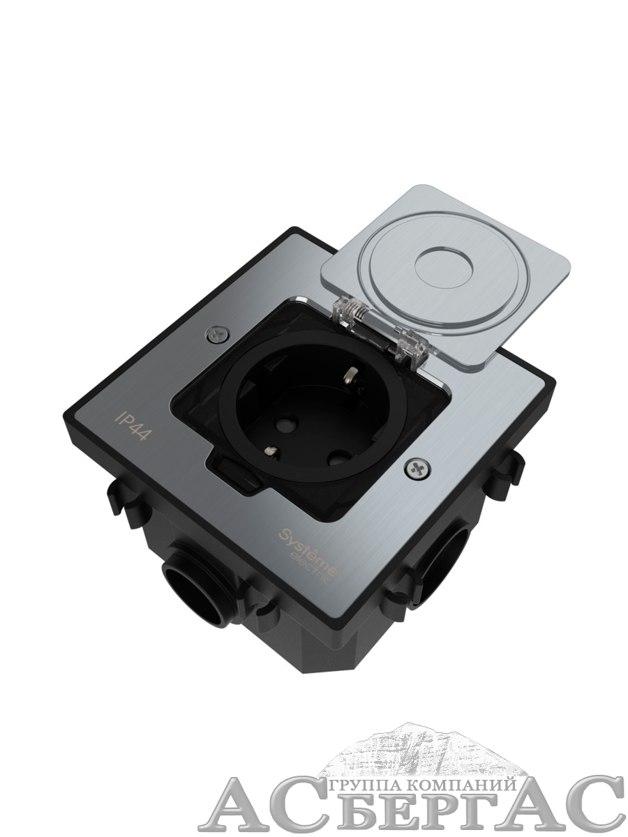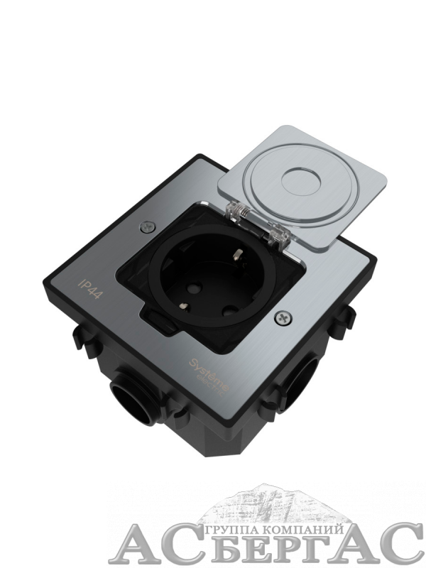 Лючок с розеткой 2К+З, 16А/250В, IP44 с монтажной коробкой для бетонных полов (серебро) MultiDesk Systeme Electric