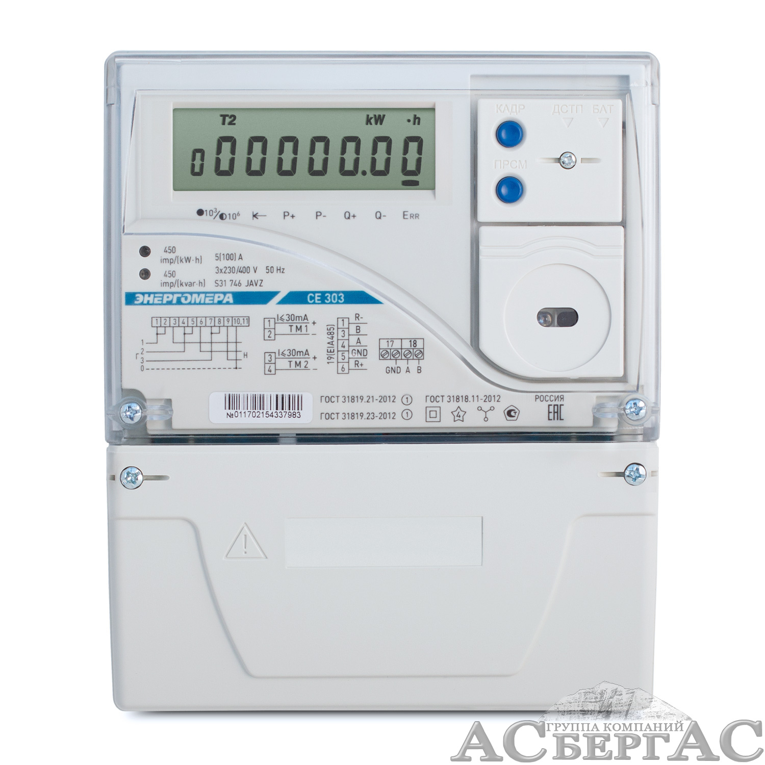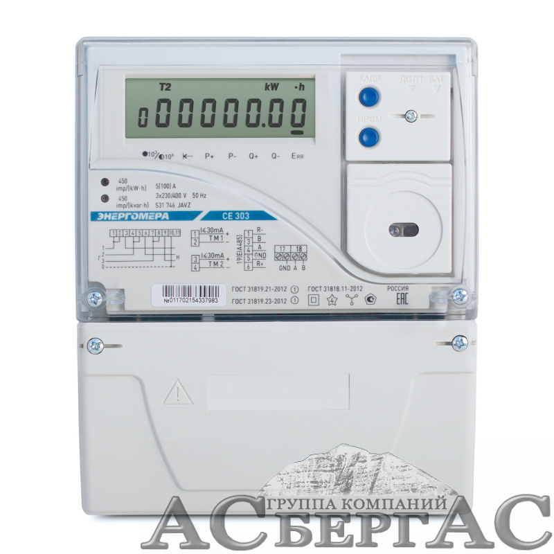 CE303 S31 746 JGVZ GS01 Счётчик акт. и реакт.эн. 3-х фазный, 4-х тарифный, 5-100А, кл.т.1, ЖКИ, оптопорт, GSM/GPRS, резерв.питание Энергомера