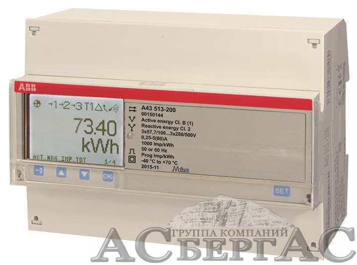 A43 513-200 Счетчик 3-фазный акт-реакт. энергии(2Н),4-тарифный c тарификатором,кл. точн. 1,прямого вкл. 5(80)А,4 вх/вых,M-bus,тип ABB