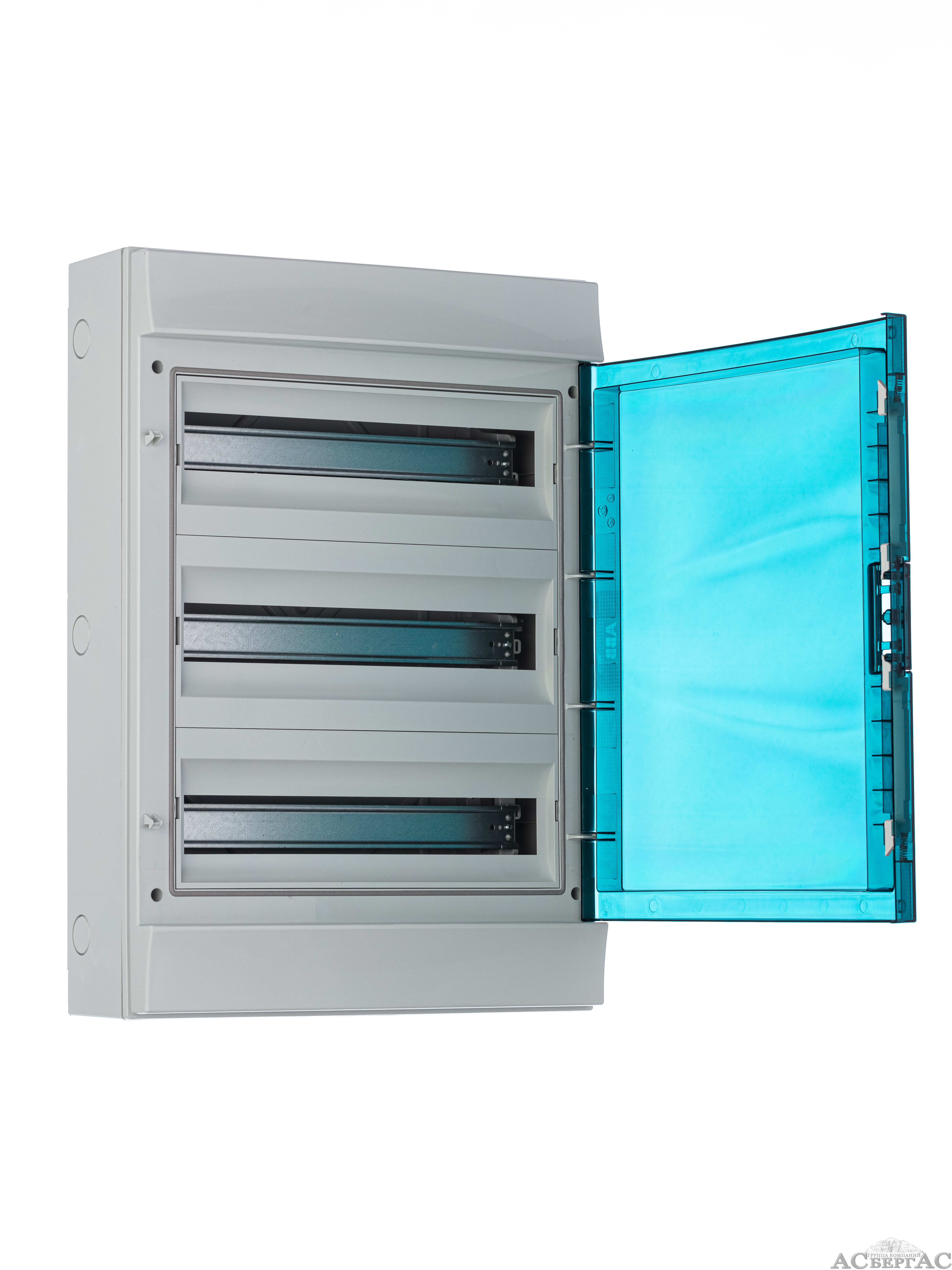 Шкаф Mistral 65-54М – представляет из себя пластиковый, настенный бокс с внешними габаритами 430х600х155 миллиметров. Бокс имеет 3 DIN-рейки на которые можно установить до 54 модулей устройств. Бокс состоит из лицевой панели с прозрачной бирюзовой дверкой, съёмной рамы с DIN-рейками, держателей для нулевой шины и шины заземления.