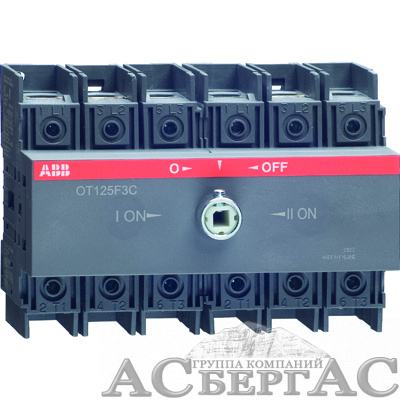 Реверсивный (перекидной) рубильник OT100F3С производства компании ABB предназначен для обеспечения бесперебойной подачи питания и моментального переключения с одной питающей линии на резервную при перегрузке источника питания или при производстве профилактических работ. Реверсивный рубильник OT100F3С предназначен для работы в цепях постоянного и переменного тока, имеет 3 полюса и рассчитан на номинальный рабочий ток 100А при резистивной нагрузке (например, нагреватели) или 80А индуктивной нагрузки (например, электродвигатели). Рабочий температурный диапазон выключателя OT100F3С – от -40 до +60 градусов Цельсия, то есть рубильник может быть установлен в том числе и в неотапливаемых помещениях или в уличных щитах.