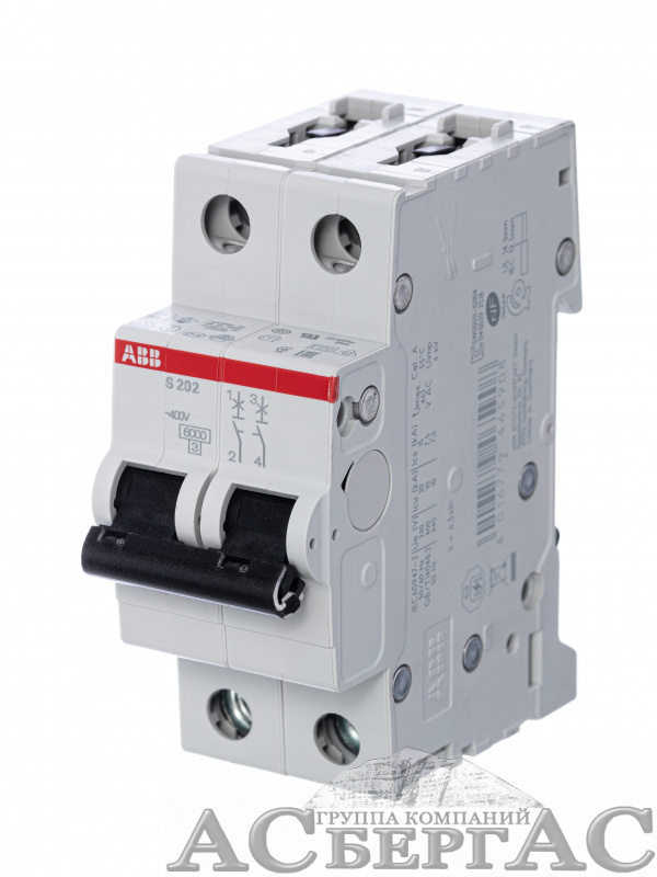 S202 D1 Автоматический выключатель 2-полюсный, 1А, 6кА (хар-ка D) ABB
