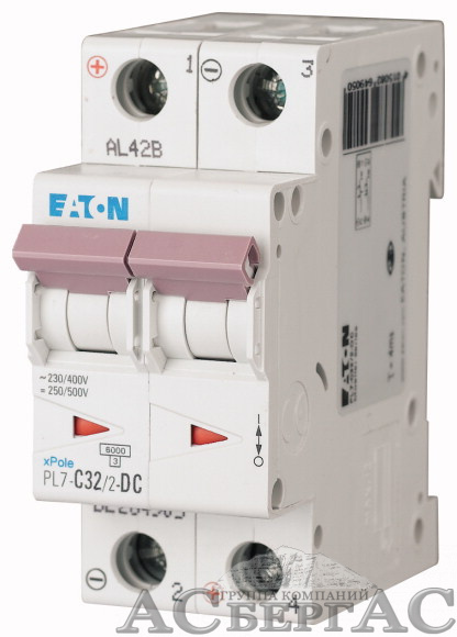 264905 PL7-C32/2-DC Автоматический выключатель 2-полюсный, 32А, 6kA, DC (хар-ка C) Eaton