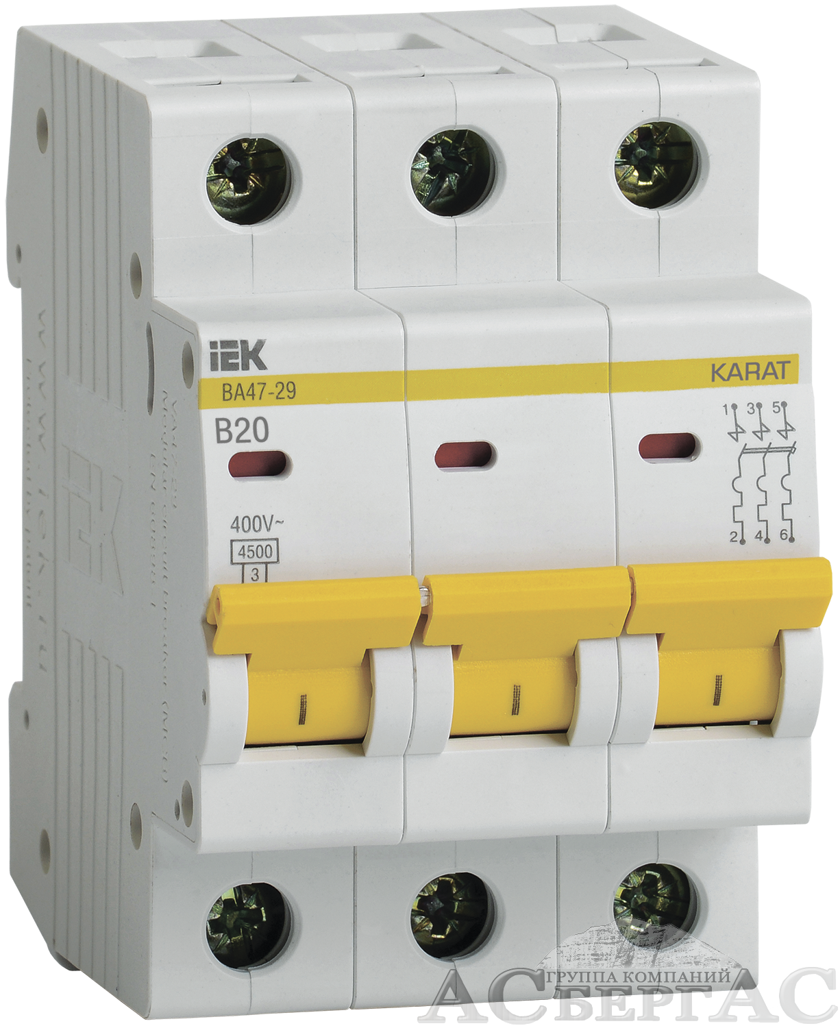 ВА47-29 Автоматический выключатель 3-полюсный, 20А, 4,5kA (хар-ка B) ИЭК