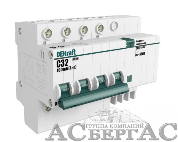 ДИФ-101 Дифф. автомат 4-полюсный, 25А, 300mA, тип AC, 4,5kA (хар-ка C) DEKraft