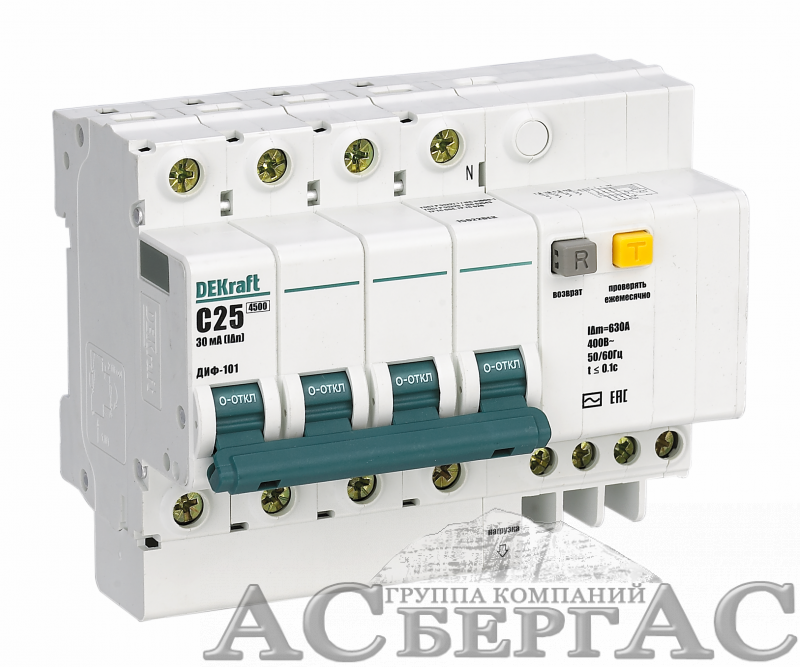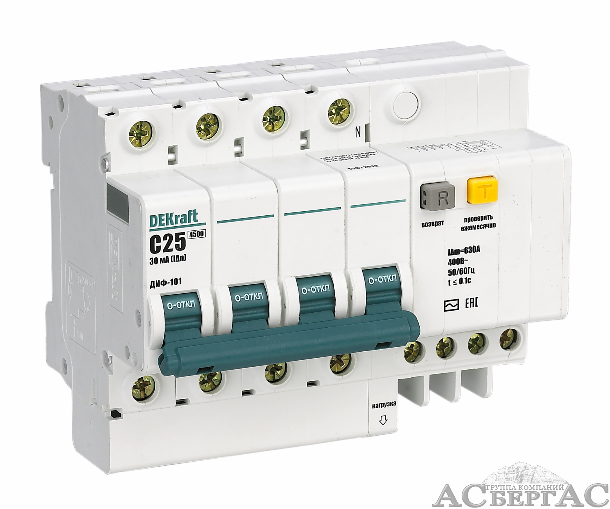 ДИФ-101 Дифф. автомат 4-полюсный, 6А, 100mA, тип AC, 4.5kA (хар-ка D) DEKraft