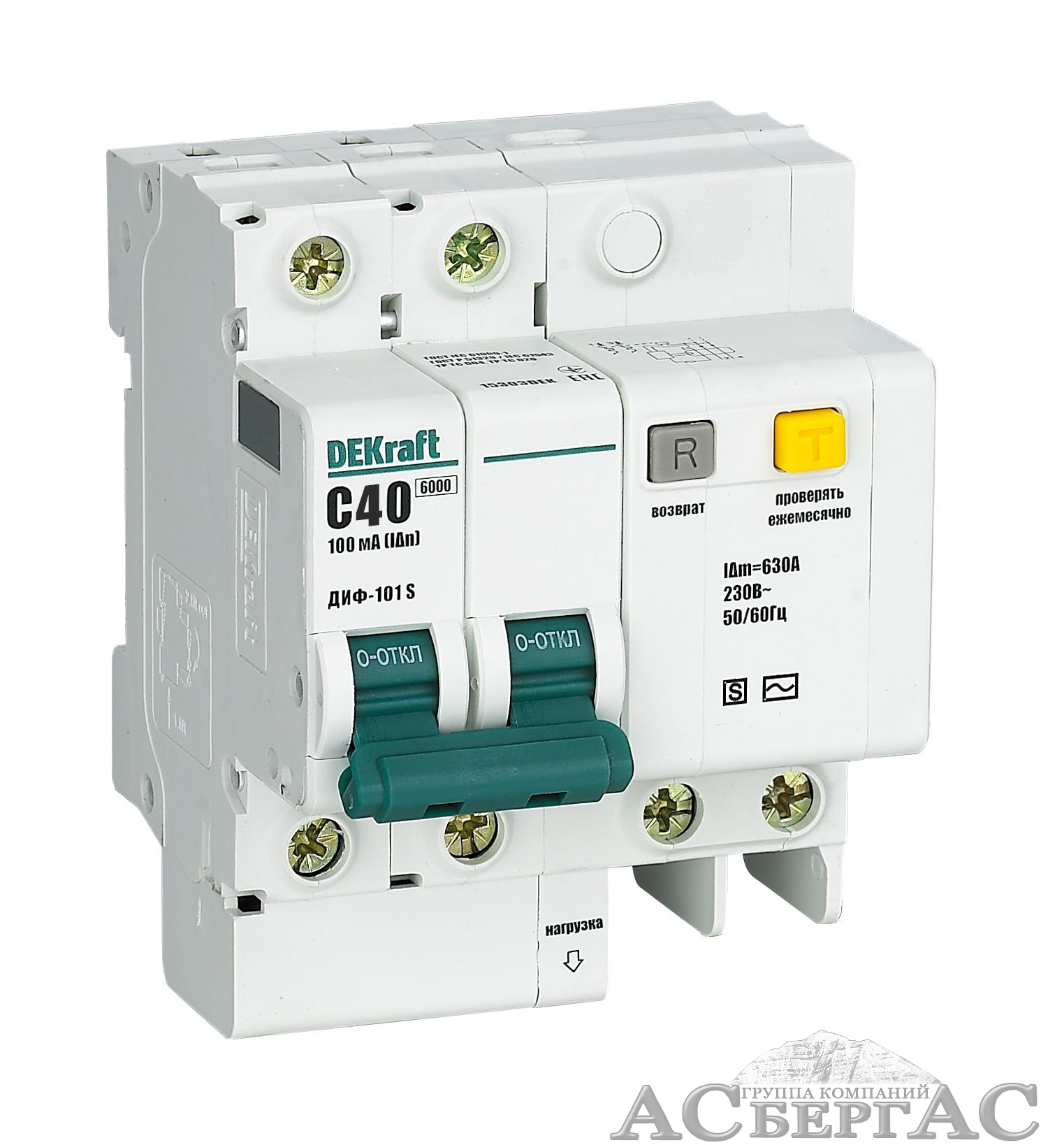 ДИФ-101 S Дифф. автомат 2-полюсный, 40А, 100mA, тип AC-S, 4,5kA (хар-ка C) DEKraft