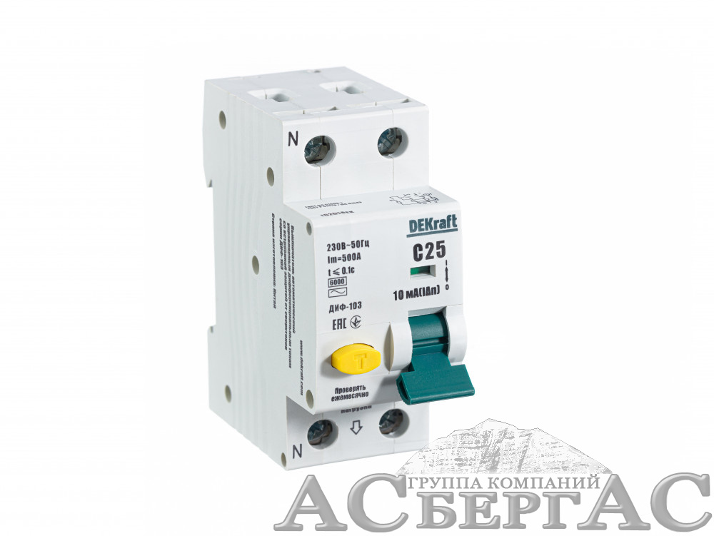 ДИФ-103 Дифф. автомат 1P+N, 25А, 10mA, тип AC, 6kA (хар-ка C) DEKraft