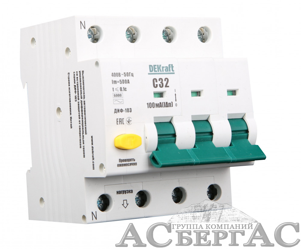 ДИФ-103 Дифф. автомат 3P+N, 40А, 30mA, тип A, 6kA (хар-ка C) DEKraft