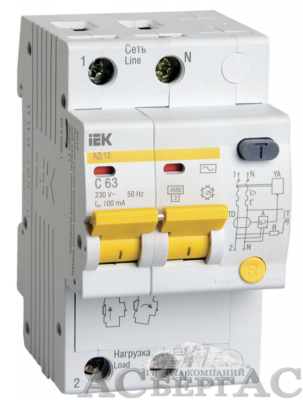 АД-12 Дифф. автомат 2-полюсный, 63А, 100mA, 4,5kA, тип AC (хар-ка C) ИЭК