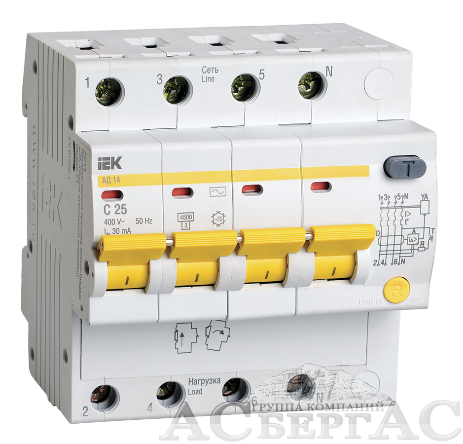 АД-14 Дифф. автомат 4-полюсный, 25А, 30mA, 4,5kA, тип AC (хар-ка C) ИЭК