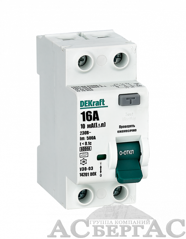 УЗО-03 Блок утечки тока 2-полюсный, 40A, 30mA, тип А, 6kA DEKraft