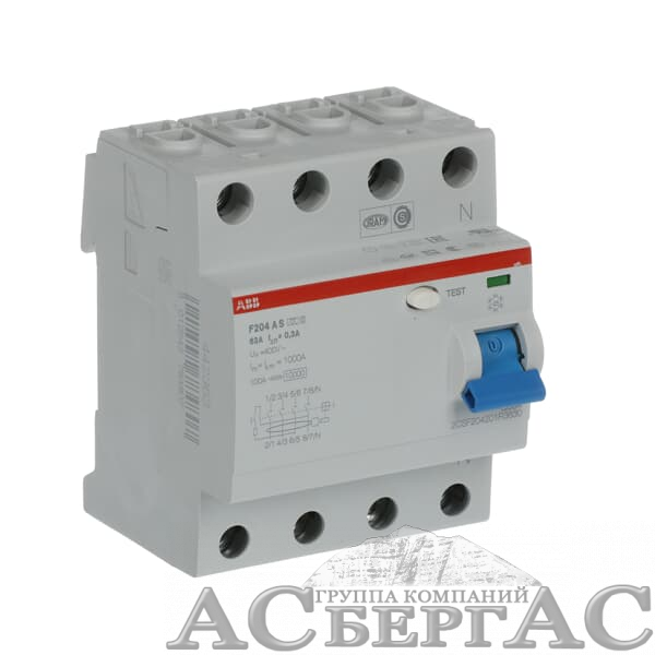 F204 A-S 63/300 Блок утечки тока 4-полюсный, 63A, 300mA, тип A-S (УЗО) ABB