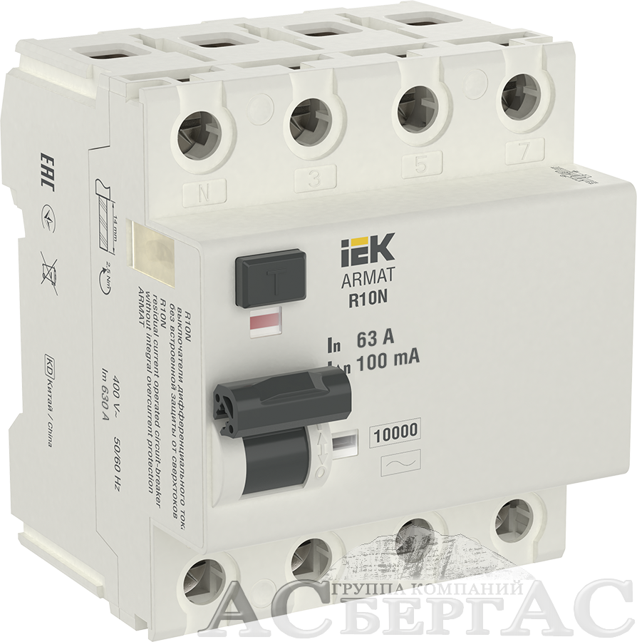 R10N Блок утечки тока 4-полюсный, 63А 100mA, 10kA, тип AC ИЭК
