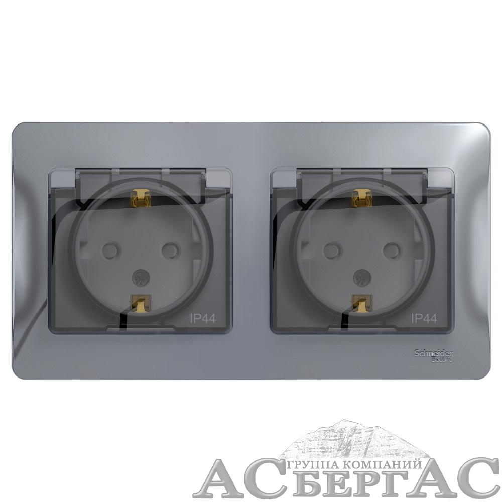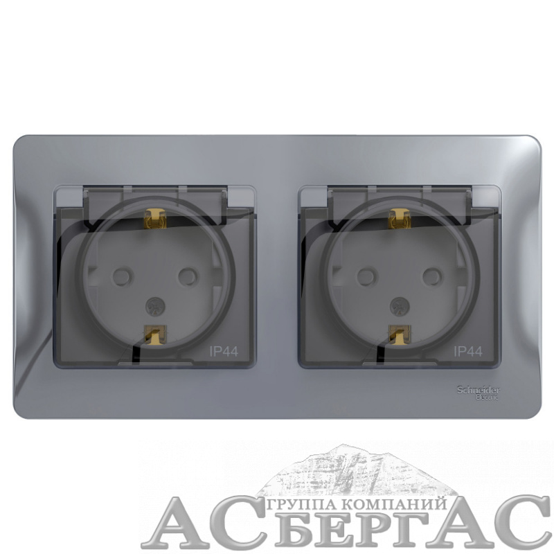 Розетка двойная с заземлением и со шторками IP44, в сборе (алюминий) Glossa Systeme Electric