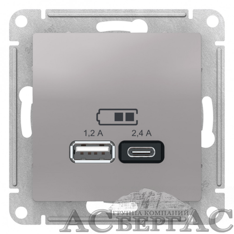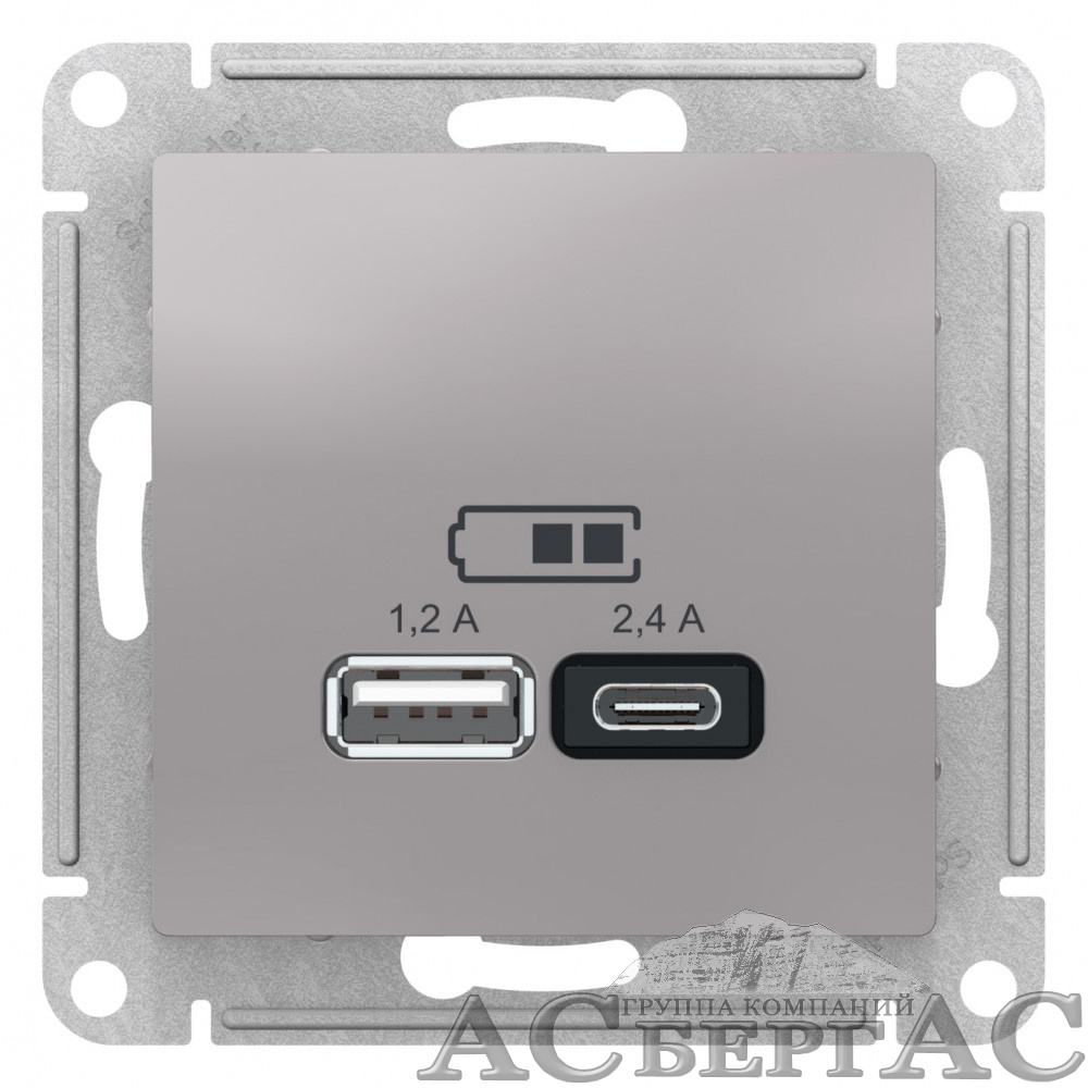 Розетка USB A+С, 5В/2,4А, 2х5В/1,2А, механизм (алюминий) Atlas Design Systeme Electric