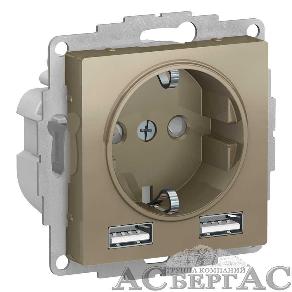 Розетка 16А c 2 USB A+A, 5В/2,4А, 2х5В/1,2А, механизм (шампань) Atlas Design Systeme Electric