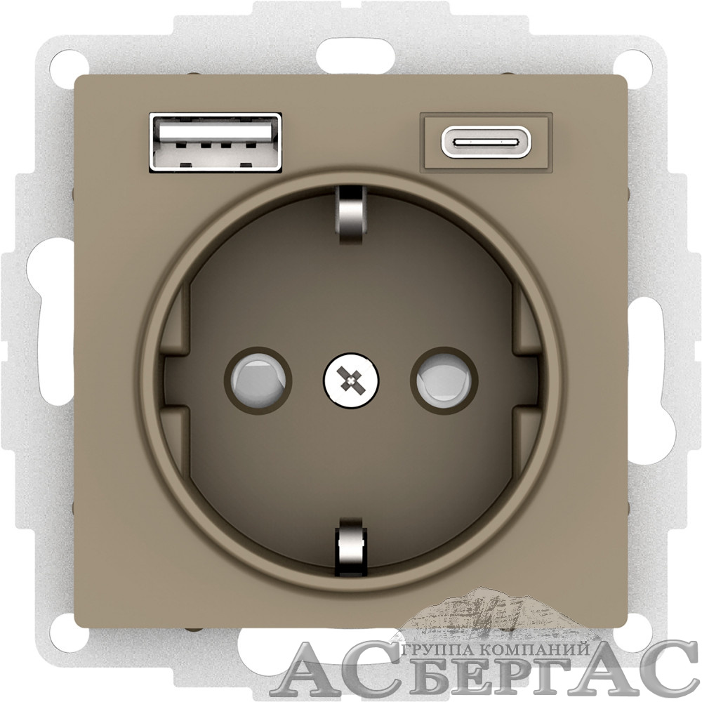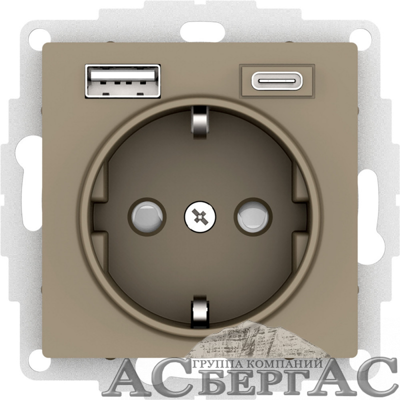 Розетка 16А c 2 USB A+C, 5В/2,4А/3,0А, 2х5В/1,5А, механизм (шампань) Atlas Design Systeme Electric