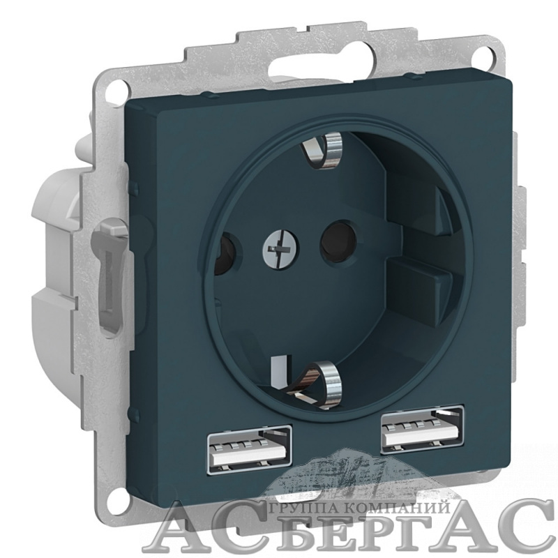 Розетка 16А c 2 USB A+A, 5В/2,4 А, 2х5В/1,2 А, механизм (изумруд) Atlas Design Systeme Electric
