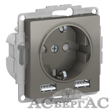 Розетка 16А c 2 USB A+A, 5В/2,4 А, 2х5В/1,2 А, механизм (сталь) Atlas Design Systeme Electric