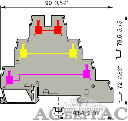 D4/6.T3.V0 Клеммник 4мм.кв. - 3 сквозные цепи на DIN-рейку TYCO