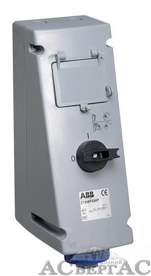 216 MP6WP Розетка с рубильником, механической блокировкой и Din рейкой на 4 модуля 216MP6WP, 16A, 2P+E, IP67, 6ч ABB