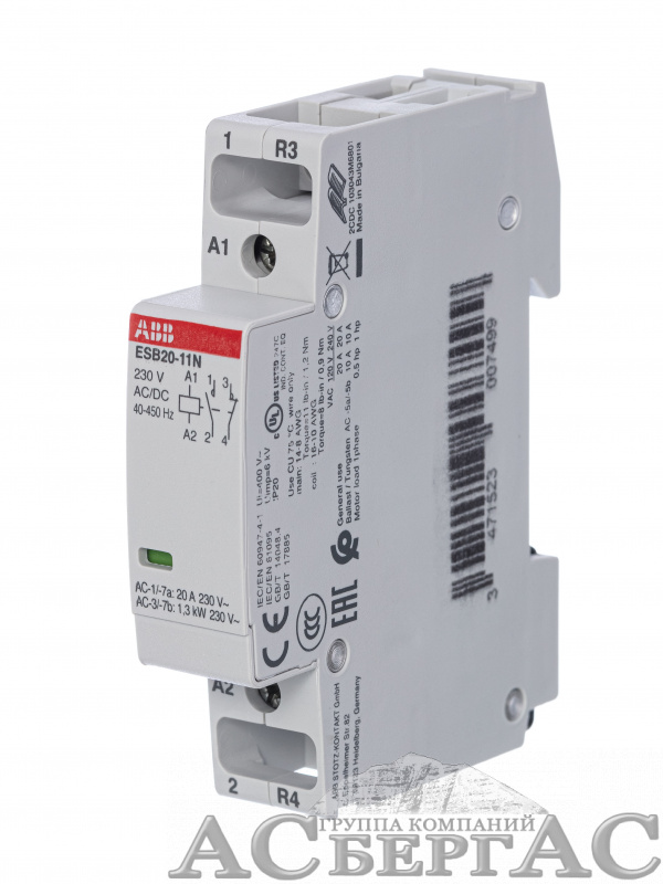 ESB20-11N-06 Контактор модульный (20А АС-1, 1НО+1НЗ), 230В AC/DC ABB