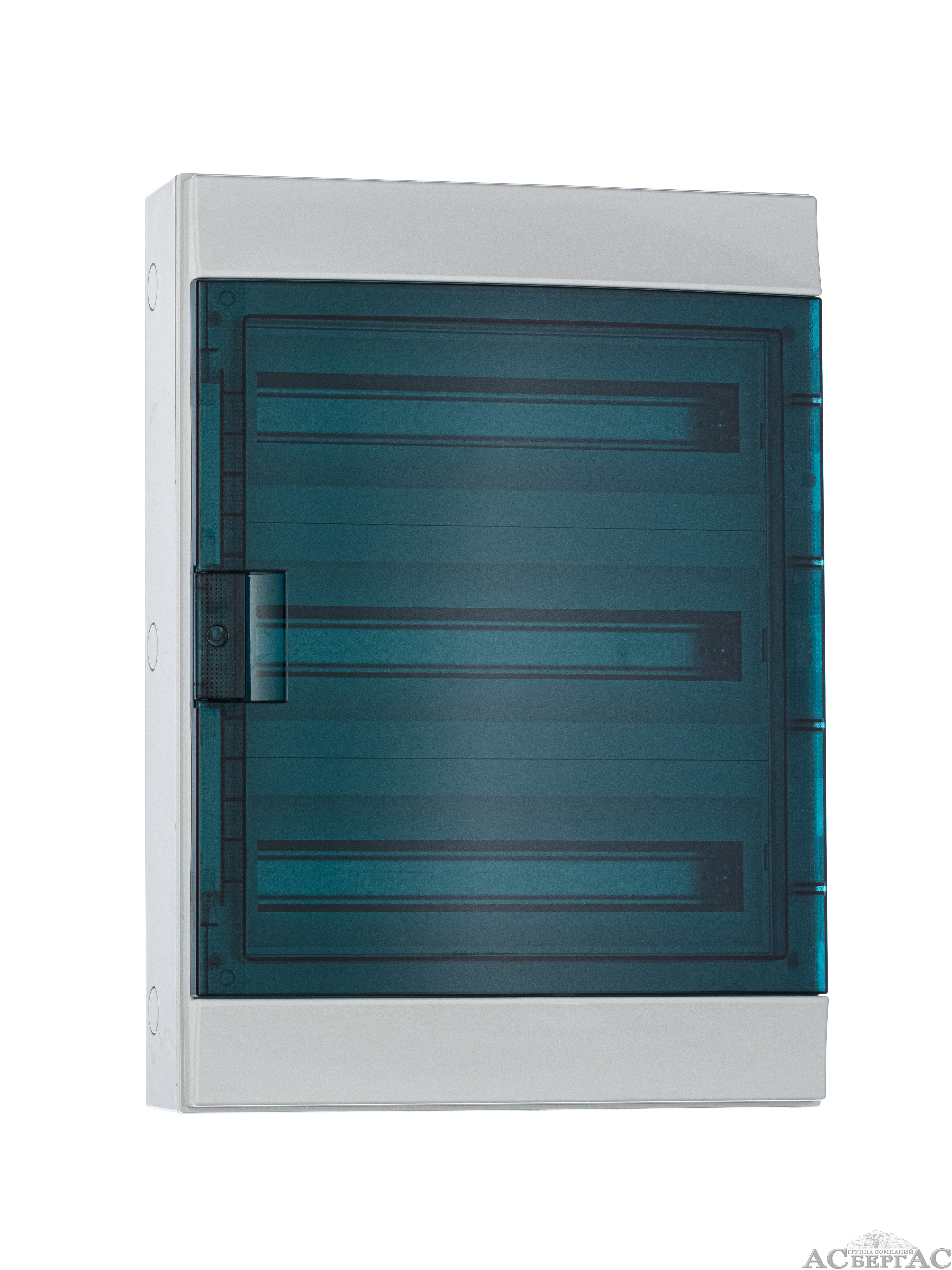 Шкаф Mistral 65-54М – представляет из себя пластиковый, настенный бокс с внешними габаритами 430х600х155 миллиметров. Бокс имеет 3 DIN-рейки на которые можно установить до 54 модулей устройств. Бокс состоит из лицевой панели с прозрачной бирюзовой дверкой, съёмной рамы с DIN-рейками, держателей для нулевой шины и шины заземления.