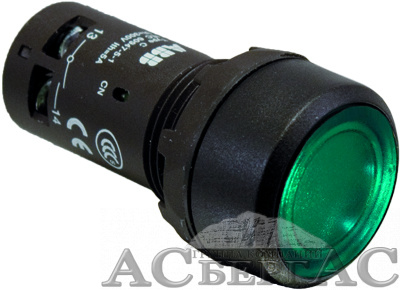 CP2-13G-10 Кнопка зелёная с подсветкой 220В AC/DC с плоской клавишей с фиксацией 1НО ABB