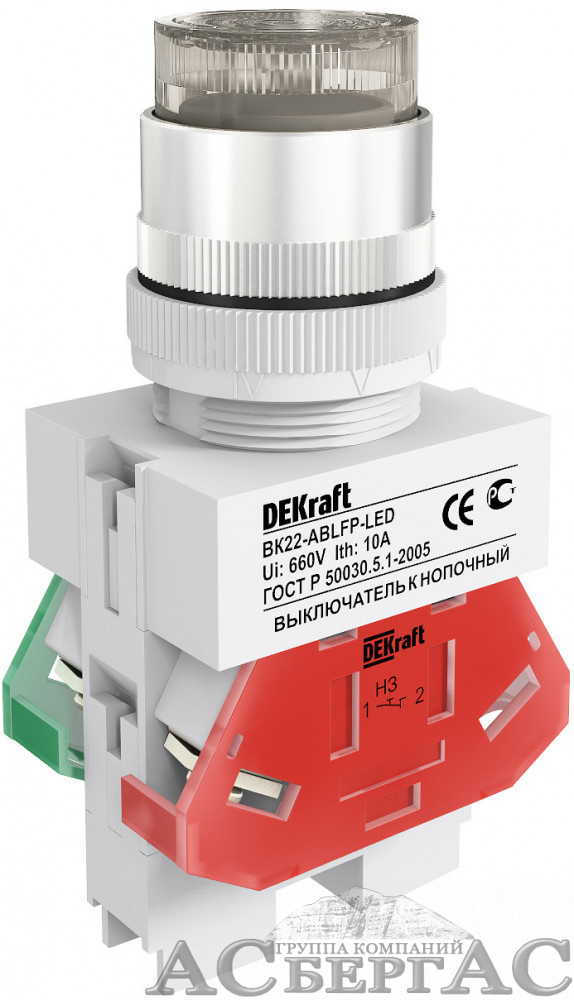 ВК22-ABLFP-WHI-LED-24 Кнопка выступающая белая с подсветкой 20 мм, 24В AC/DC DEKraft