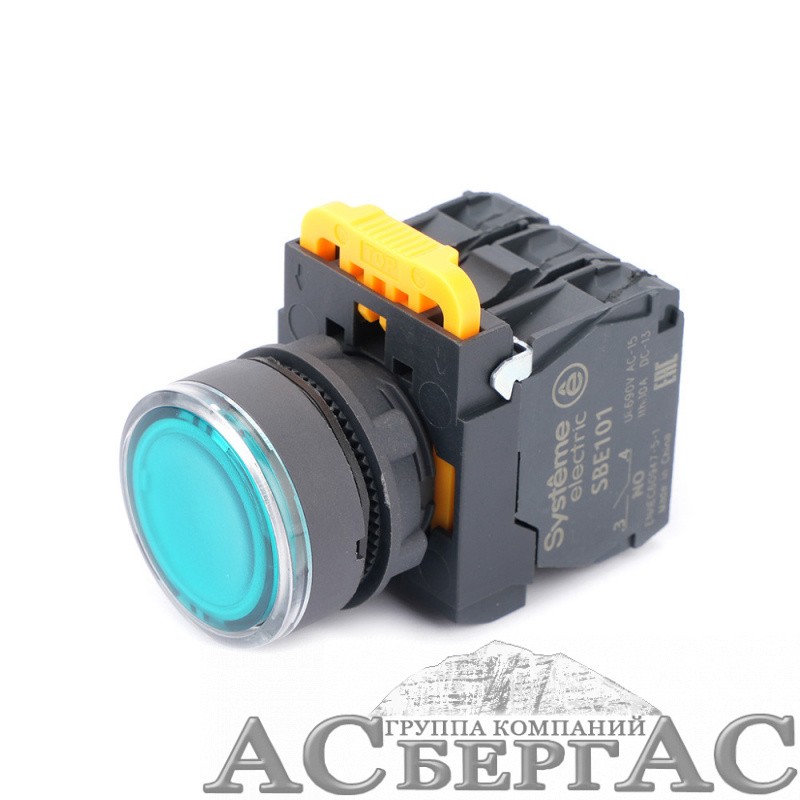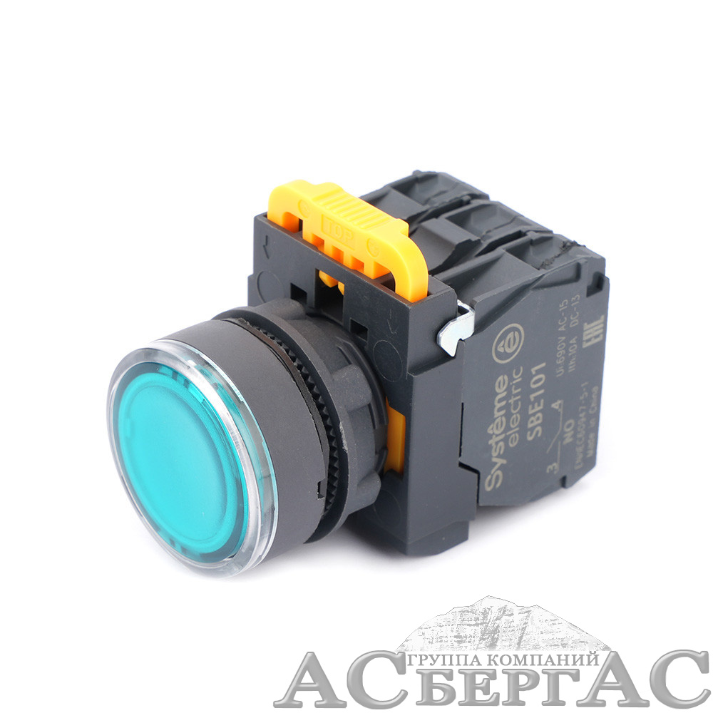 Кнопка с подсветкой в сборе модуль 22мм зеленая пластик 230-240В AC 1НО+1НЗ Systeme Electric